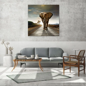 Impression sur verre - Image sur verre - Un éléphant marchant le long d'une route à travers un paysage au coucher du soleil - 70x100cm - Et pas du tout en porcelaine - Décoration murale moderne pour le salon et la chambre ARTTOR