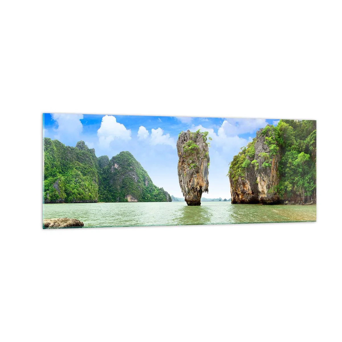 Impression sur verre - Image sur verre - Une formation rocheuse exotique entourée d'eau et de verdure sous un ciel bleu. - 140x50cm - Merveilles rocheuses de la nature - Décoration murale moderne pour le salon et la chambre ARTTOR