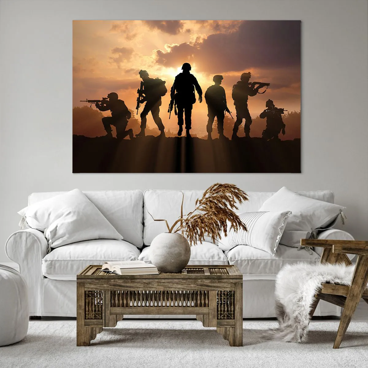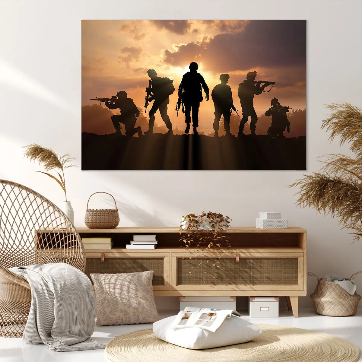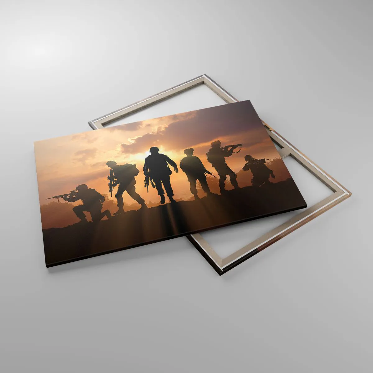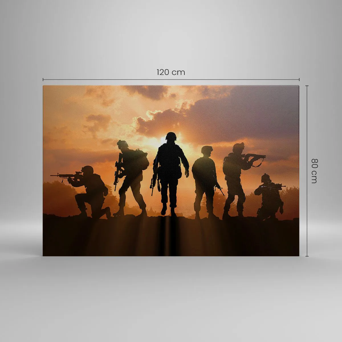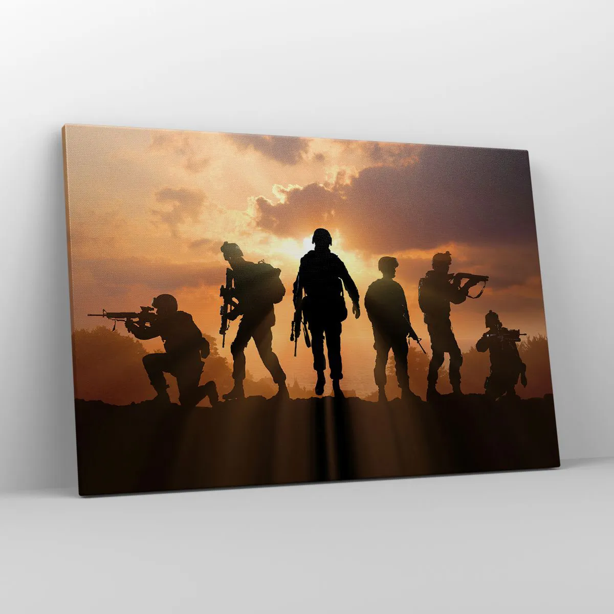 Impression sur toile - Image sur toile - Soldats sur fond de soleil couchant dans un décor dynamique - 120x80cm - Brothers in arms - Décoration murale moderne pour le salon et la chambre ARTTOR