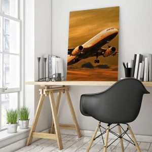 Impression sur verre - Image sur verre - Un avion décollant dans un ciel orange - 50x70cm - Vol vers le soleil - Décoration murale moderne pour le salon et la chambre ARTTOR