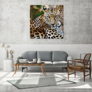 Impression sur verre - Image sur verre - Un léopard sauvage se reposant parmi la verdure - 50x70cm - Sauvage et calme - Décoration murale moderne pour le salon et la chambre ARTTOR