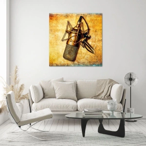 - Ce tableau artistique représente un microphone doré sur un fond vintage aux tons chauds. C'est la décoration idéale pour les amateurs de musique et d'art.