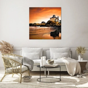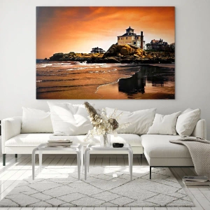 Impression sur verre - Image sur verre - Une maison sur un rocher près de la plage au coucher du soleil avec son reflet dans l'eau - 140x50cm - L'élégance de la côte ouest - Décoration murale moderne pour le salon et la chambre ARTTOR