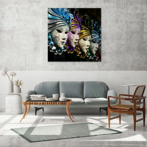 Impression sur verre - Image sur verre - Masques vénitiens colorés en rangée - 120x80cm - Mystère en or et argent - Décoration murale moderne pour le salon et la chambre ARTTOR