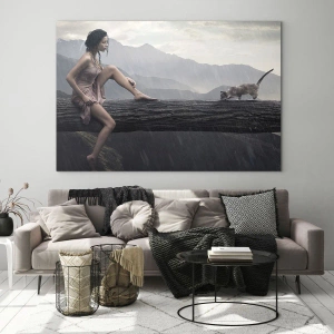 Impression sur verre - Image sur verre - Une femme et un chat sur une bûche de bois dans un paysage pluvieux - 50x70cm - Des sommets de beauté - Décoration murale moderne pour le salon et la chambre ARTTOR