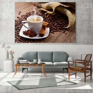 Impression sur verre - Image sur verre - Une tasse de café avec de la cannelle et des grains de café sur une table en bois - 120x80cm - Saveur et arôme épicés - Décoration murale moderne pour le salon et la chambre ARTTOR