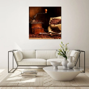 Impression sur verre - Image sur verre - Un vieux moulin à café avec des grains et un sac dans un style rustique. - 80x120cm - Nature morte avec grains de café et moulin - Décoration murale moderne pour le salon et la chambre ARTTOR