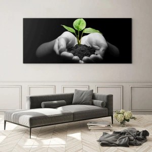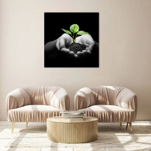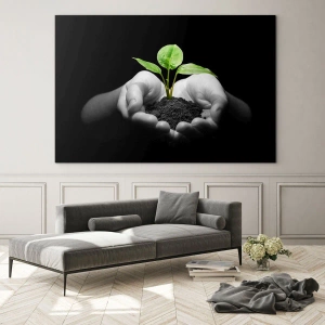 Impression sur verre - Image sur verre - Une jeune plante dans les mains sur un fond noir - 50x70cm - J'aime la nature, je la protège - Décoration murale moderne pour le salon et la chambre ARTTOR