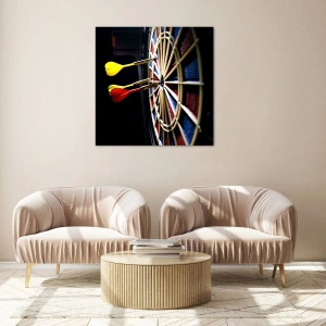 Impression sur verre - Image sur verre - Des fléchettes frappant une cible dans un environnement sombre - 50x70cm - Droit au but - Décoration murale moderne pour le salon et la chambre ARTTOR