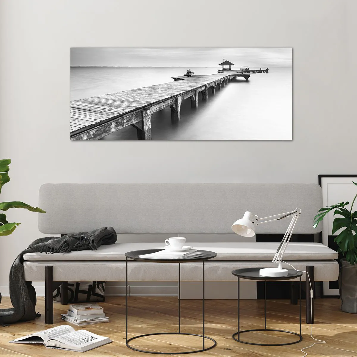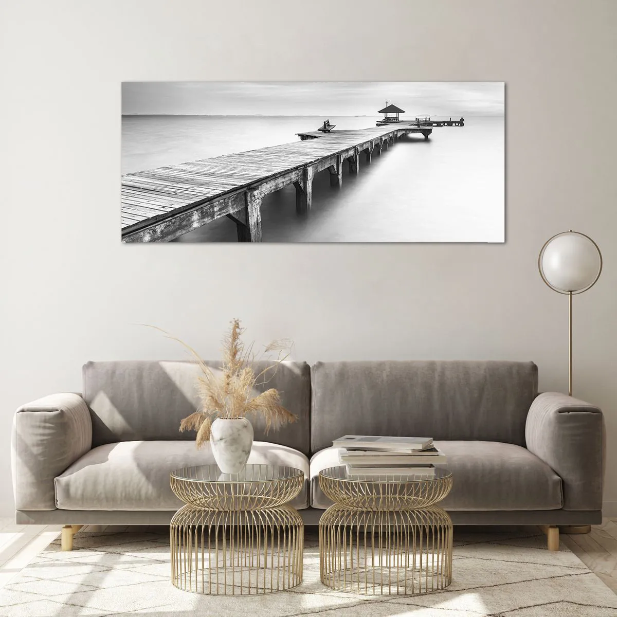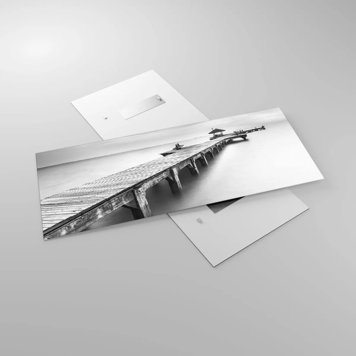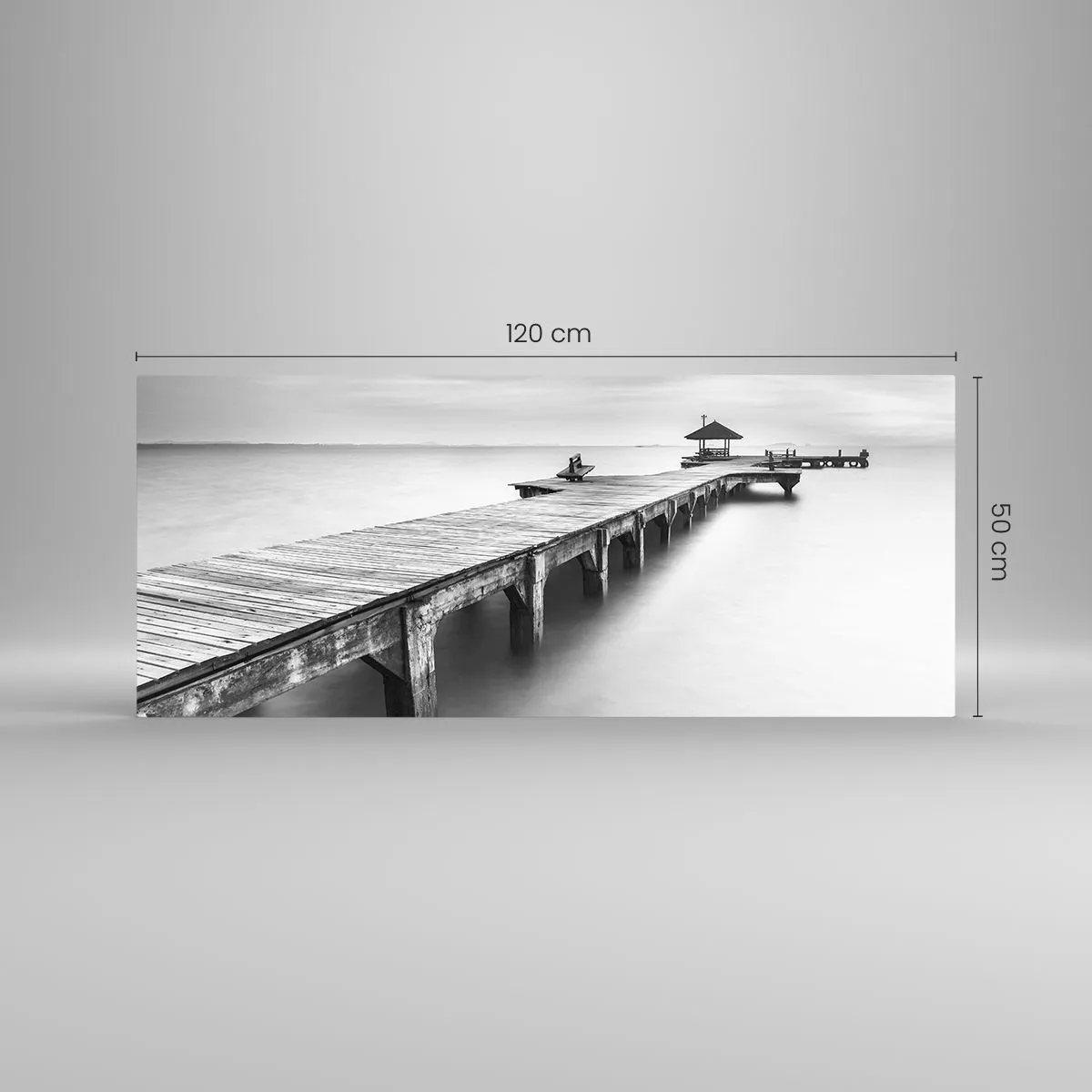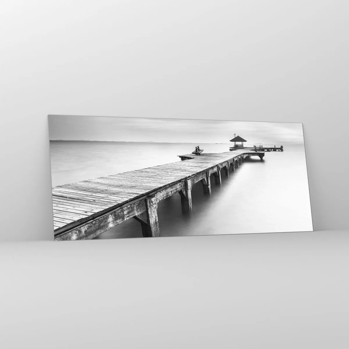 Impression sur verre - Image sur verre - Une vue en noir et blanc d'une jetée en bois sur une eau calme. - 120x50cm - À l'horizon - Décoration murale moderne pour le salon et la chambre ARTTOR