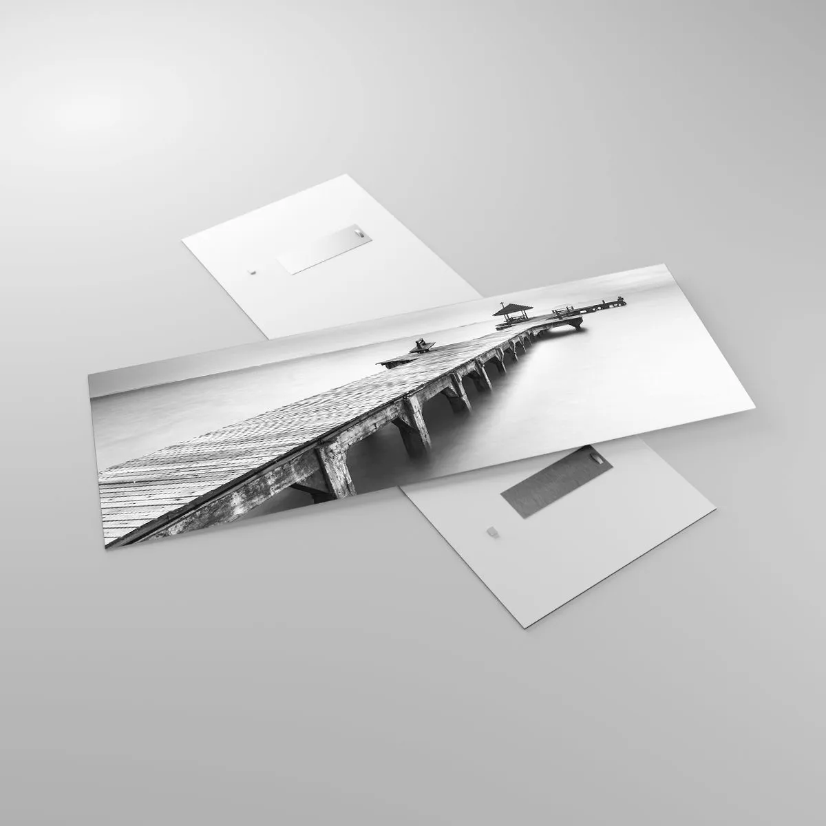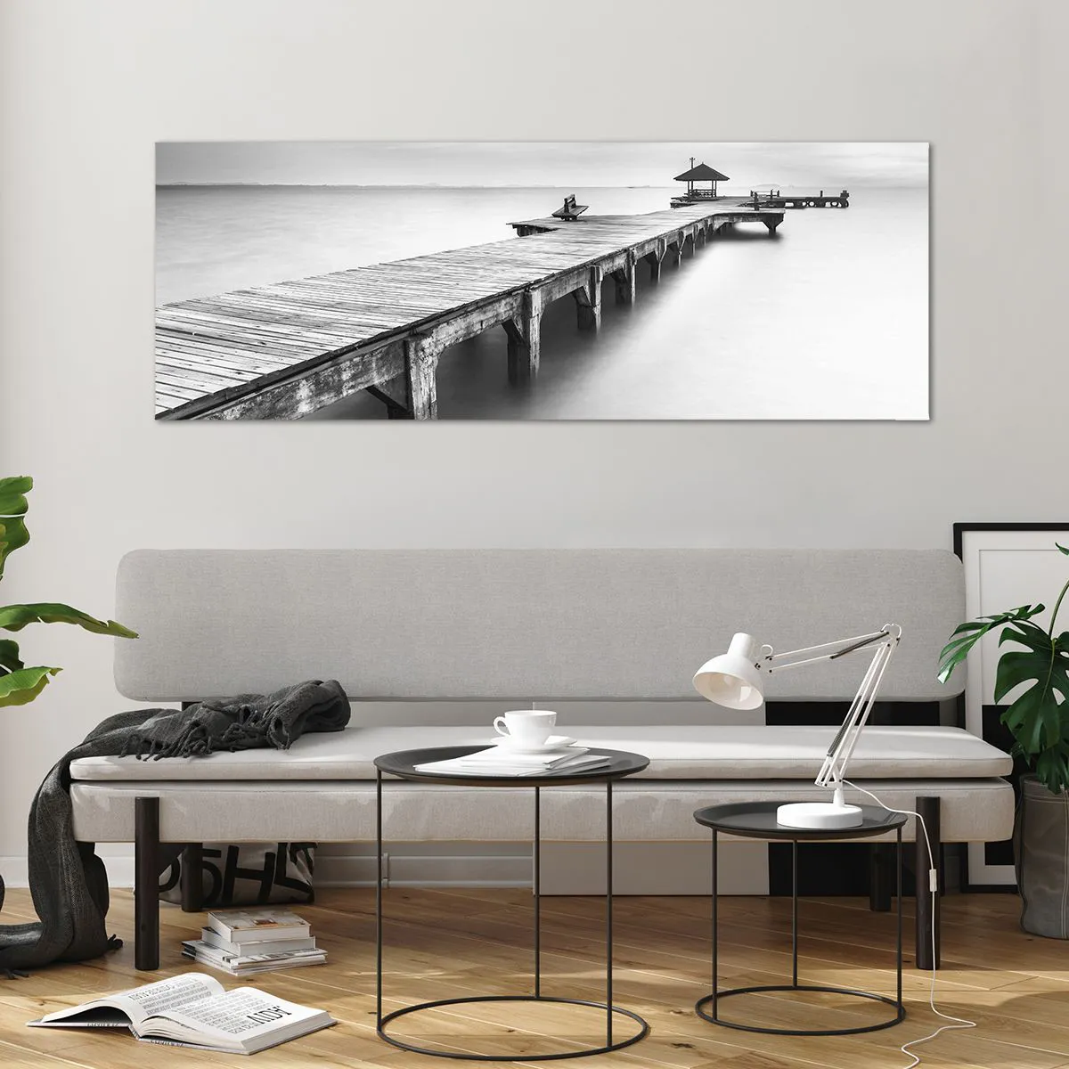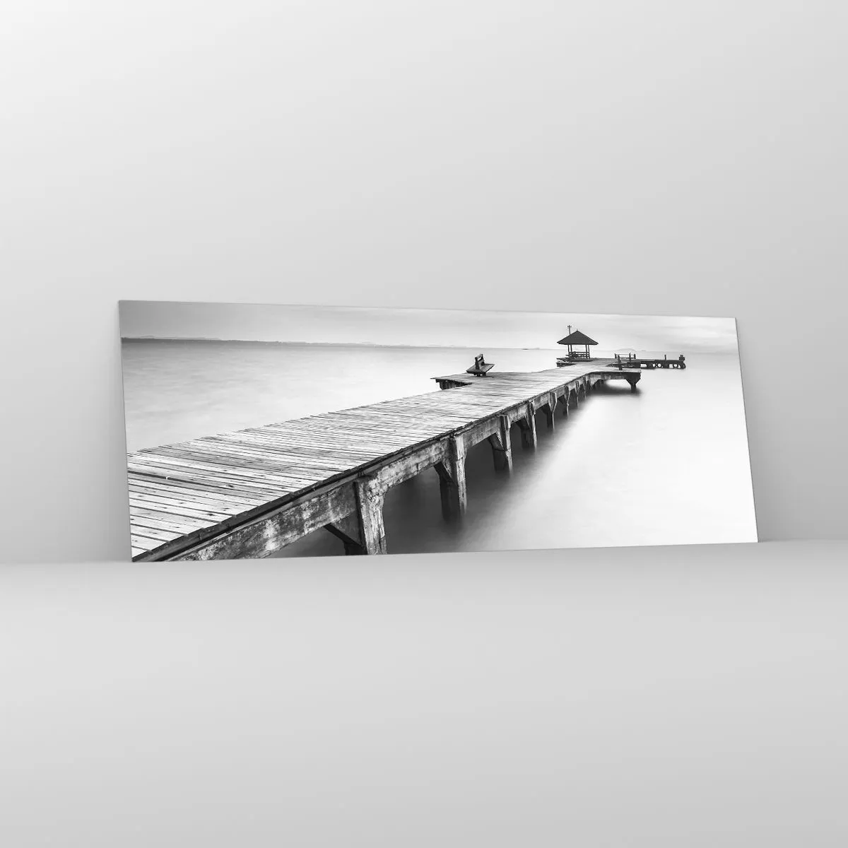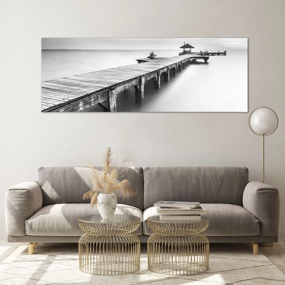 Impression sur verre - Image sur verre - Une vue en noir et blanc d'une jetée en bois sur une eau calme. - 140x50cm - À l'horizon - Décoration murale moderne pour le salon et la chambre ARTTOR
