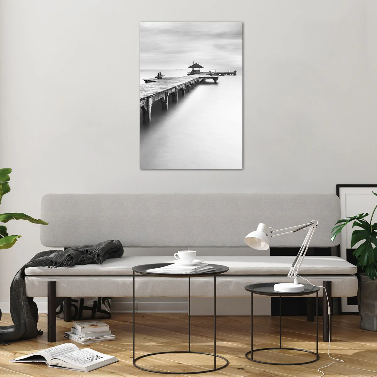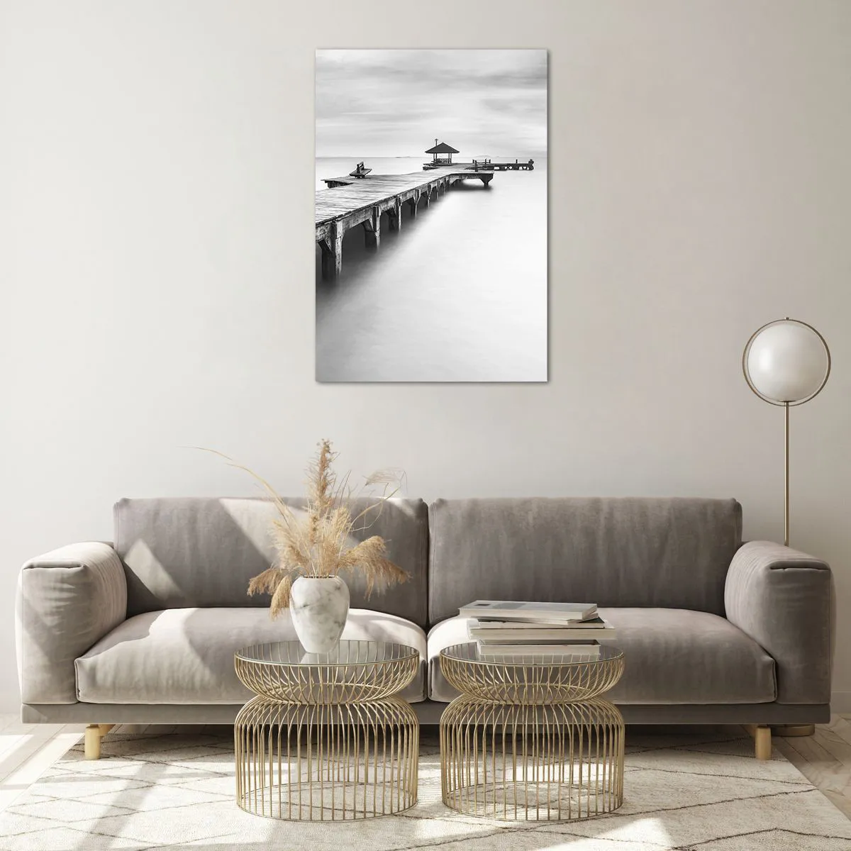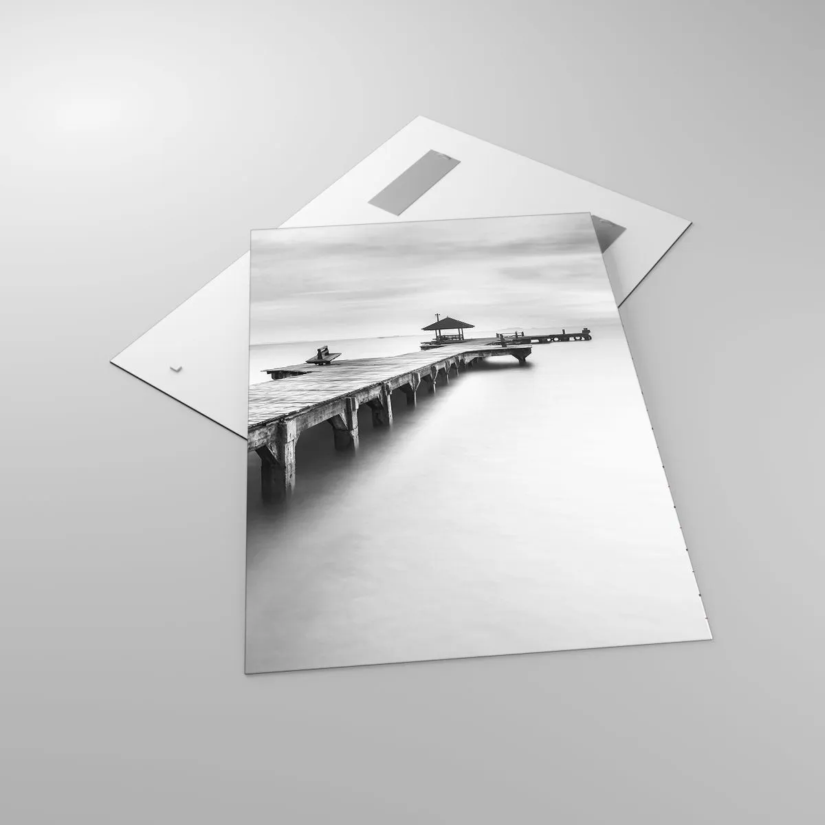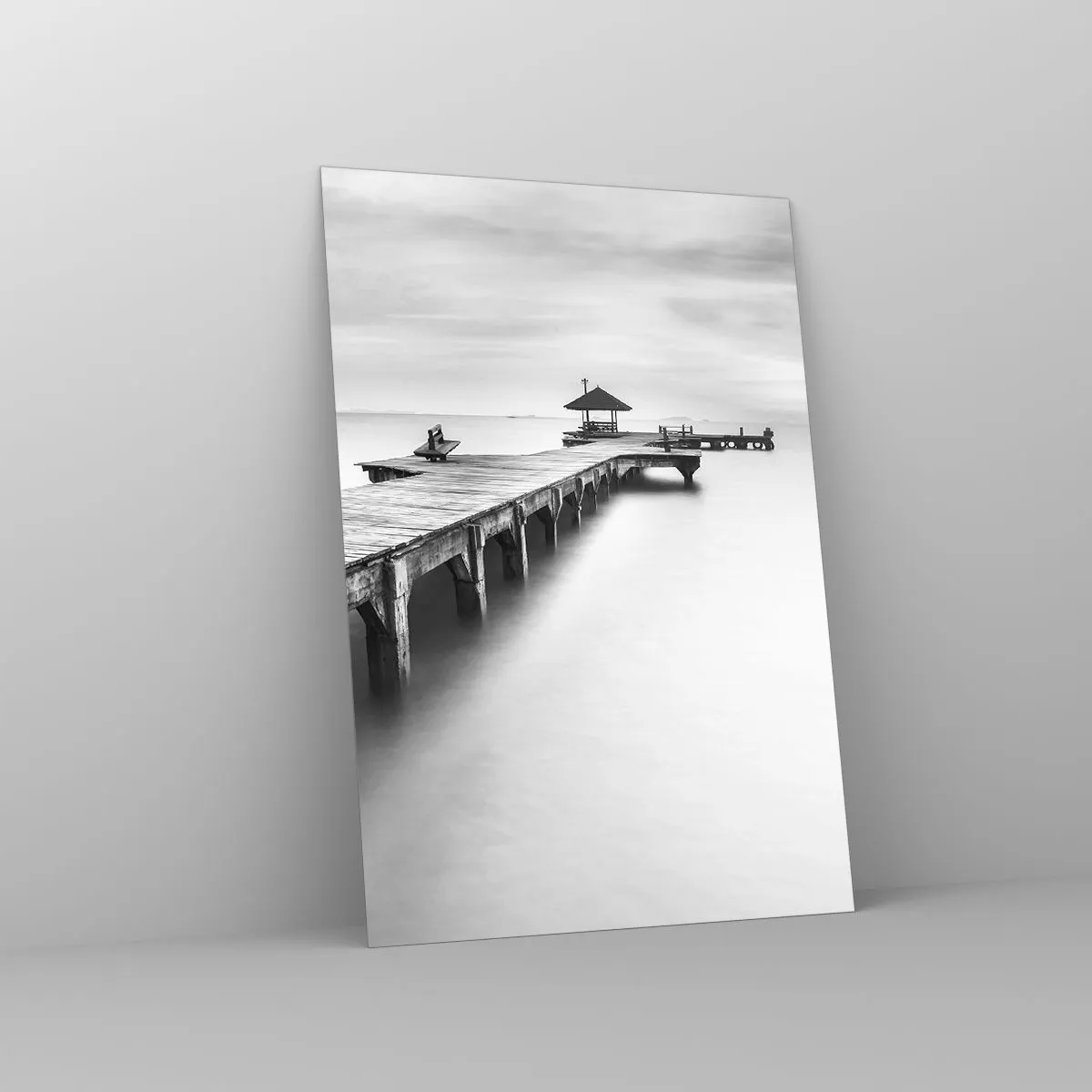 Impression sur verre - Image sur verre - Une vue en noir et blanc d'une jetée en bois sur une eau calme. - 70x100cm - À l'horizon - Décoration murale moderne pour le salon et la chambre ARTTOR