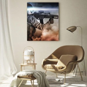 Impression sur verre - Image sur verre - Un soldat en action avec un fusil sur fond de nuages et de lumière. - 70x100cm - Tout simplement un héros - Décoration murale moderne pour le salon et la chambre ARTTOR