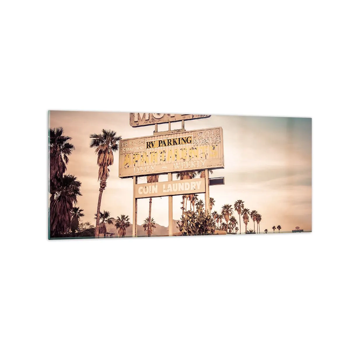 Impression sur verre - Image sur verre - Panneau de motel rétro entouré de palmiers - 120x50cm - Ici, le temps s'est arrêté - Décoration murale moderne pour le salon et la chambre ARTTOR