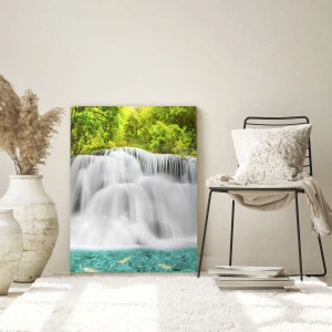 Impression sur verre - Image sur verre - Une cascade entourée de verdure avec une eau cristalline - 100x70cm - Une cascade mousseuse du vert à l'azur - Décoration murale moderne pour le salon et la chambre ARTTOR