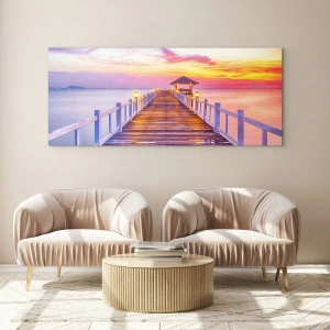 Impression sur verre - Image sur verre - Jetée en bois au coucher du soleil sur une mer calme - 50x70cm - Le silence lilas-doré du soir - Décoration murale moderne pour le salon et la chambre ARTTOR