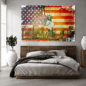 Impression sur verre - Image sur verre - Drapeau américain avec la silhouette de la Statue de la Liberté et le paysage urbain - 120x80cm - Vive l'Amérique! - Décoration murale moderne pour le salon et la chambre ARTTOR