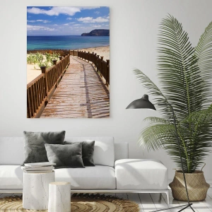 Le chemin en bois du tableau symbolise le voyage, l'harmonie avec la nature et la quête de paix. Son environnement, peuplé de sable et de verdure luxuriante, crée un contraste unique avec le bleu de la mer et du ciel. C'est le choix idéal pour ceux qui apprécient les décorations évoquant des lieux exotiques et des moments de détente à la plage.