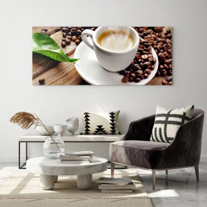 Impression sur verre - Image sur verre - Une tasse de café aromatique sur fond de grains et d'une feuille - 140x50cm - Café sur un banc - Décoration murale moderne pour le salon et la chambre ARTTOR