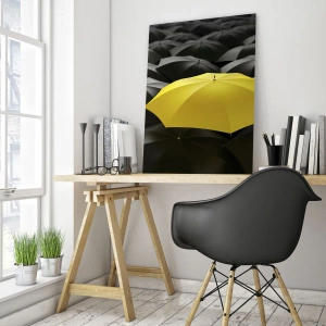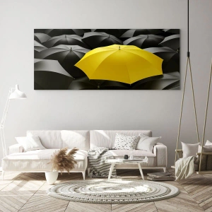 Impression sur verre - Image sur verre - Un parapluie jaune parmi des parapluies noirs - 140x50cm - Adieu chagrin - Décoration murale moderne pour le salon et la chambre ARTTOR