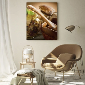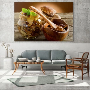 Impression sur verre - Image sur verre - Champignons marinés dans un bocal avec un bol en bois et des champignons sur la table en arrière-plan - 50x70cm - Que ce soit frais ou salé, ou en automne... - Décoration murale moderne pour le salon et la chambre