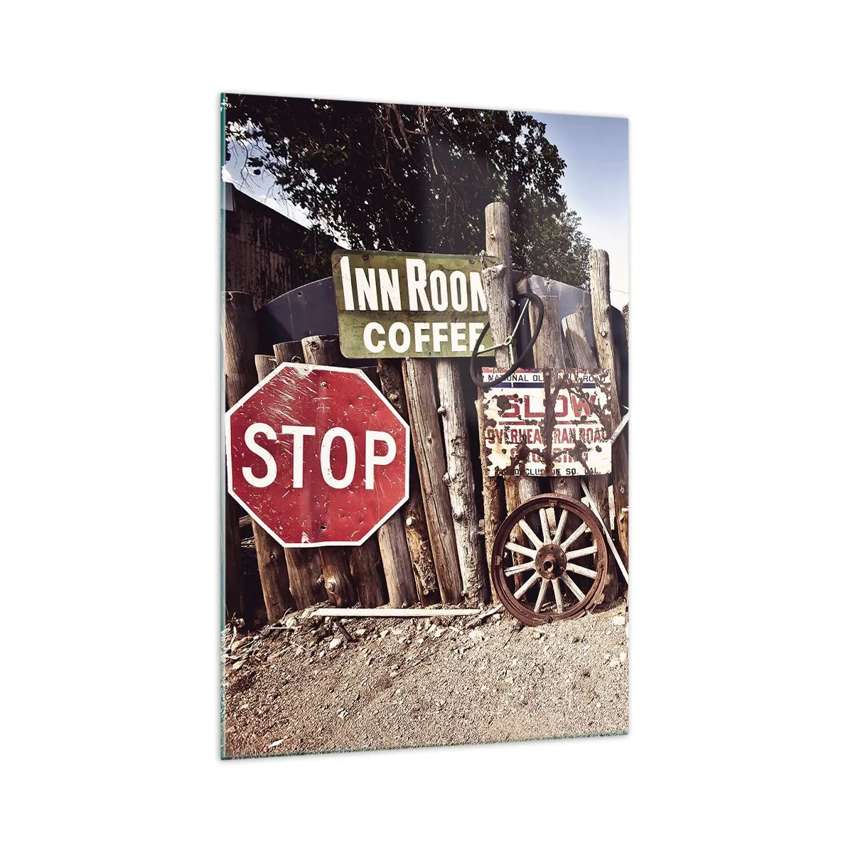 Impression sur verre - Image sur verre - Décorations rustiques avec des panneaux et une roue sur la clôture - 70x100cm - Et le temps s'est arrêté - Décoration murale moderne pour le salon et la chambre ARTTOR