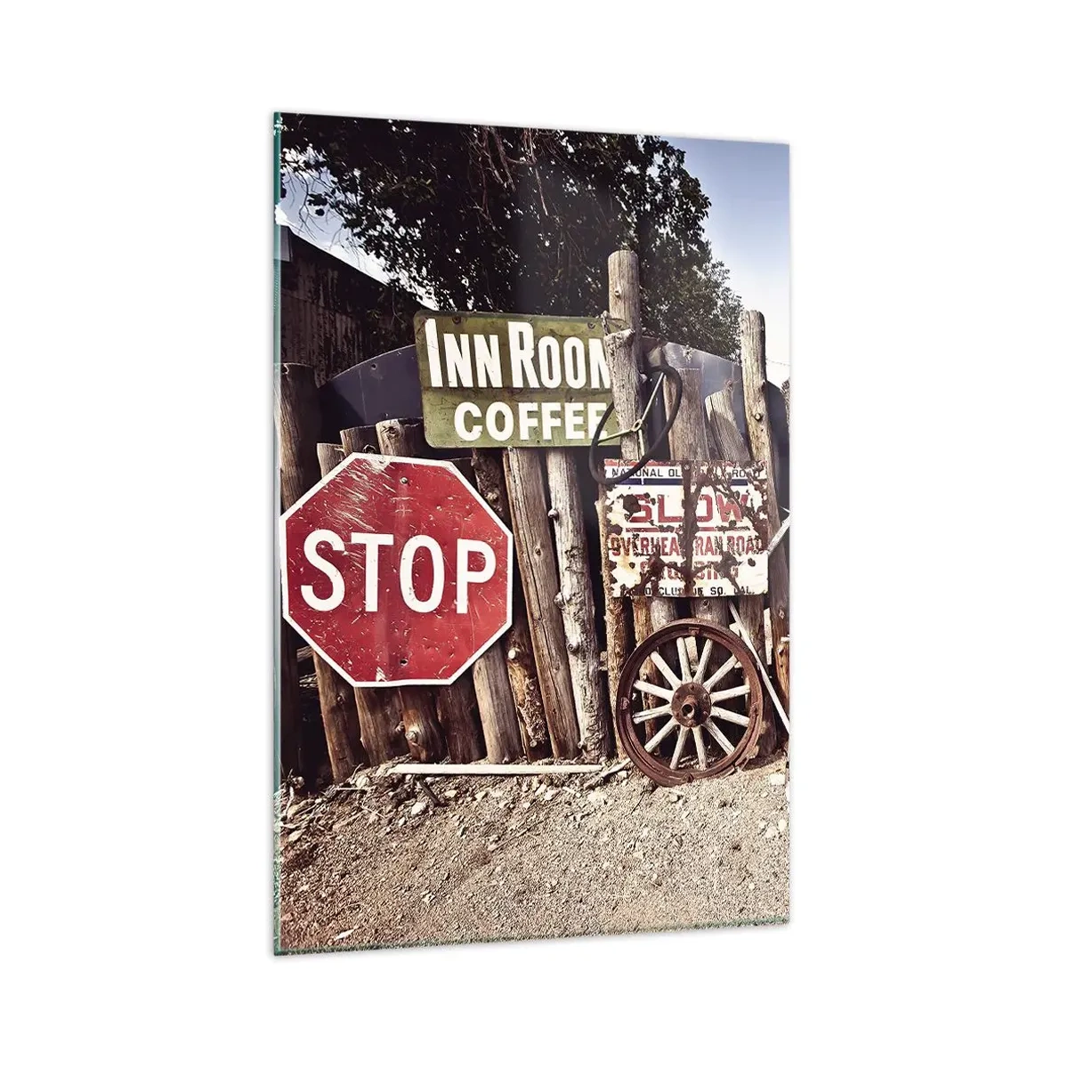 Impression sur verre - Image sur verre - Décorations rustiques avec des panneaux et une roue sur la clôture - 80x120cm - Et le temps s'est arrêté - Décoration murale moderne pour le salon et la chambre ARTTOR