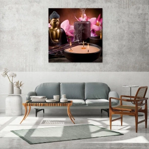 Impression sur verre - Image sur verre - Figurine de Bouddha avec bougies allumées et bâtons d'encens - 80x120cm - Vider l'esprit, calmer le corps - Décoration murale moderne pour le salon et la chambre ARTTOR