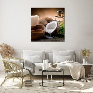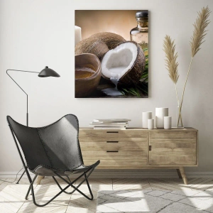 Impression sur verre - Image sur verre - Noix de coco, bougie et huile sur fond de bois - 70x100cm - Santé des îles tropicales - Décoration murale moderne pour le salon et la chambre ARTTOR