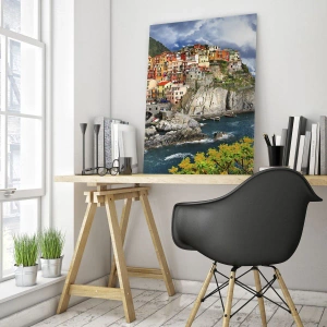 Impression sur verre - Image sur verre - Une ville colorée sur une falaise au bord de la mer - 50x70cm - Un groupe embrassant les rochers - Décoration murale moderne pour le salon et la chambre ARTTOR