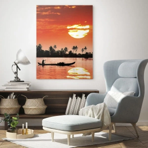 Impression sur verre - Image sur verre - Coucher de soleil sur la rivière avec des palmiers et un bateau - 50x70cm - La tranquillité des tropiques au coucher du soleil - Décoration murale moderne pour le salon et la chambre ARTTOR