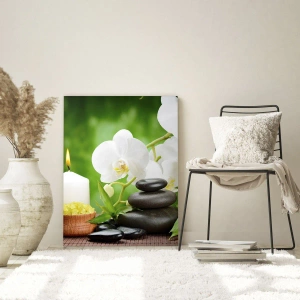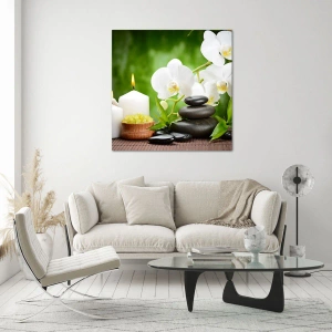 Impression sur verre - Image sur verre - Spa avec orchidées, pierres et bougies sur fond de verdure - 50x70cm - Doux, floral, toucher délicat - Décoration murale moderne pour le salon et la chambre ARTTOR