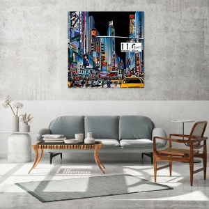 Impression sur verre - Image sur verre - Une rue animée avec des taxis jaunes et des enseignes au néon - 50x70cm - Grande nuit de bande dessinée - Décoration murale moderne pour le salon et la chambre ARTTOR