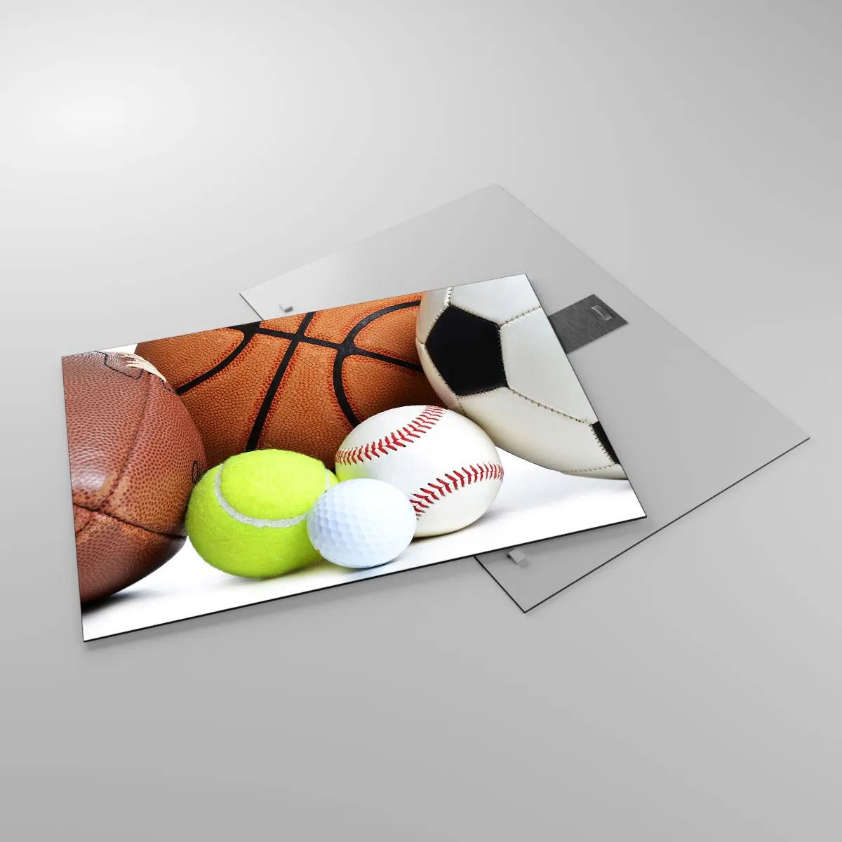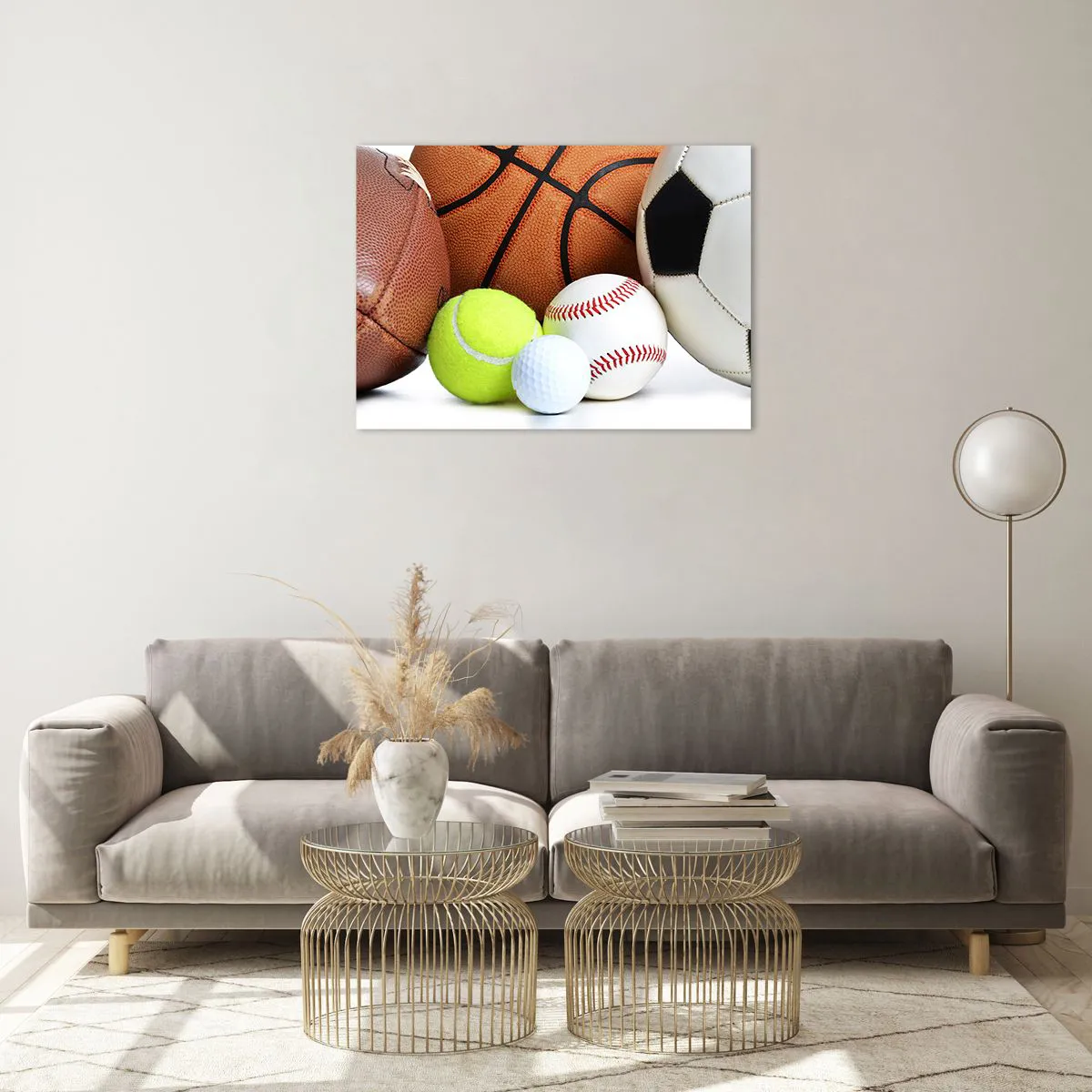 - Un tableau représentant un ensemble de ballons de sport sur fond blanc. Une décoration idéale pour les amateurs de sport et d'exercice.