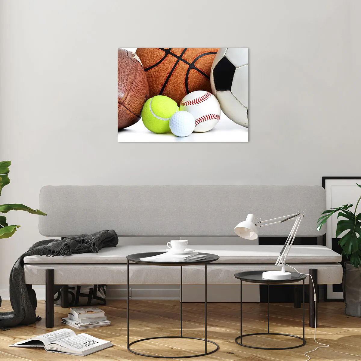 Un tableau représentant un ensemble de ballons de sport sur fond blanc. Une décoration idéale pour les amateurs de sport et d'activité physique.