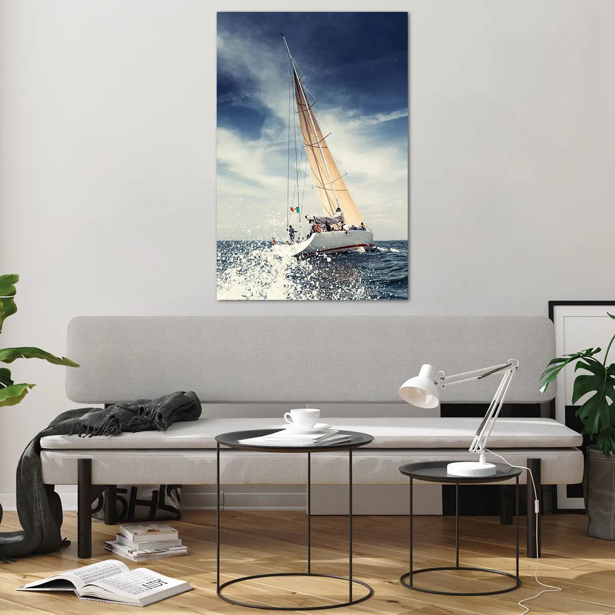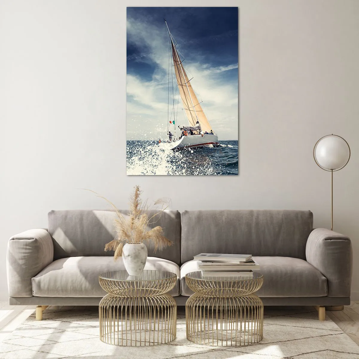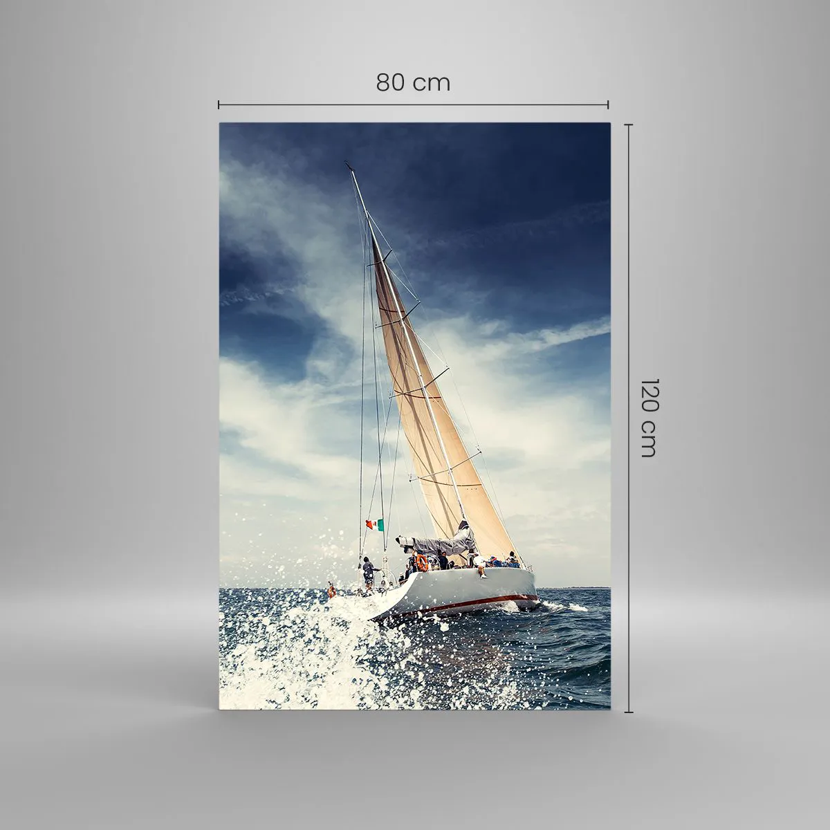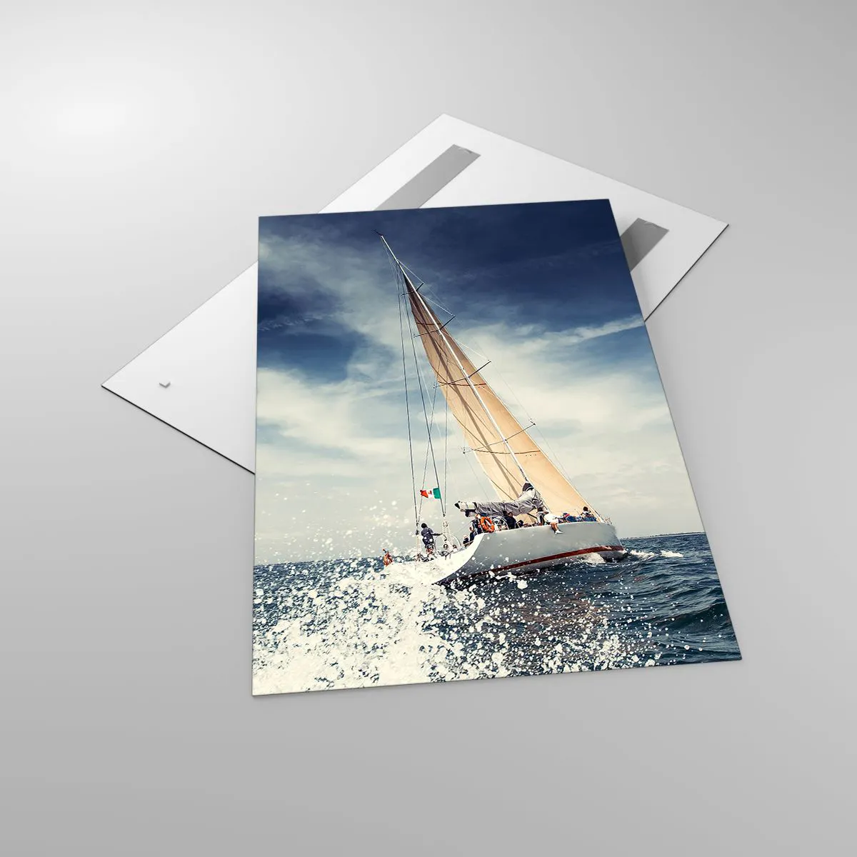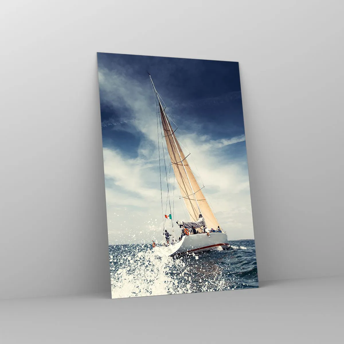Impression sur verre - Image sur verre - Un voilier sur une mer agitée sous un ciel bleu - 80x120cm - Ils ne nous rattraperont pas ! - Décoration murale moderne pour le salon et la chambre ARTTOR