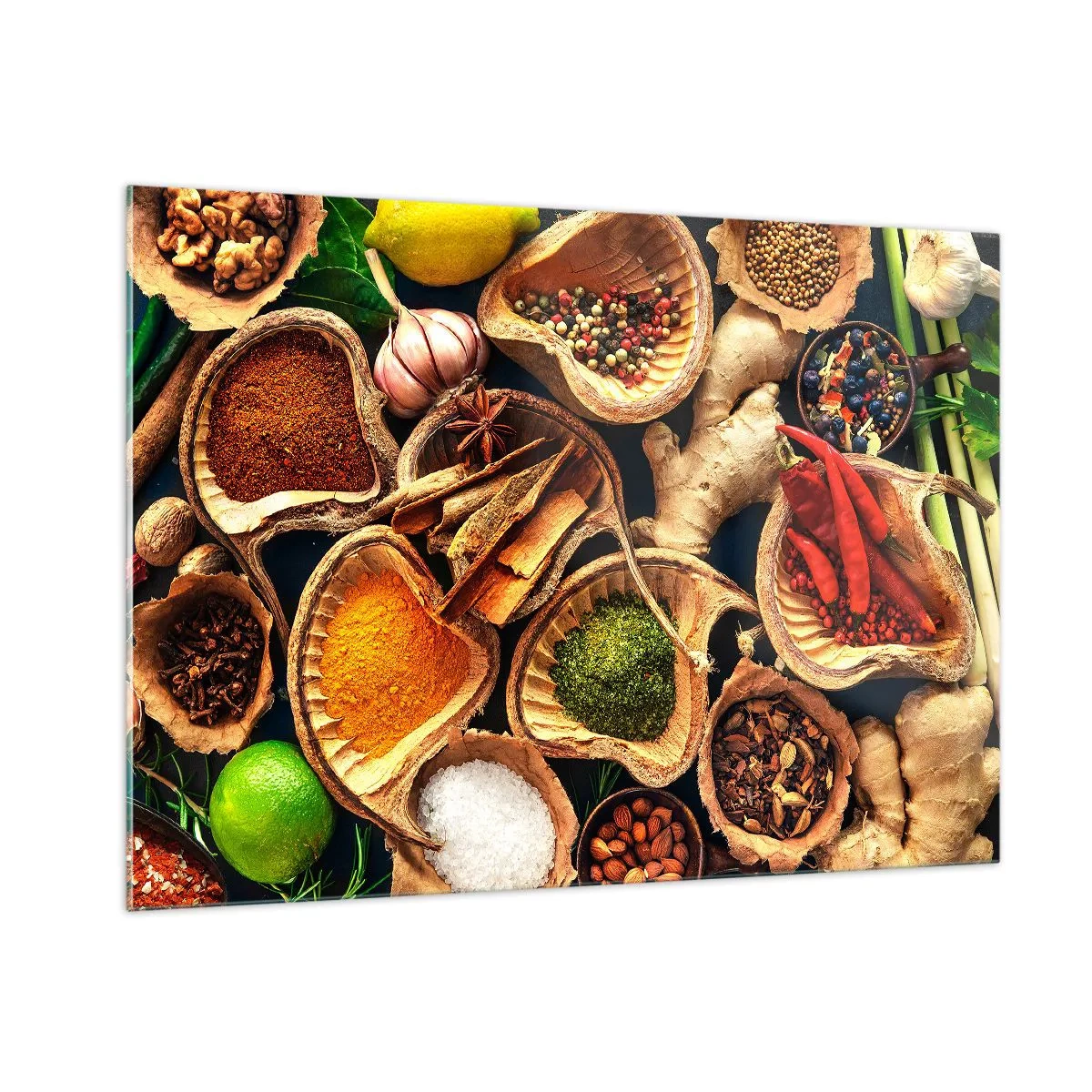 Impression sur verre - Image sur verre - Épices colorées dans des contenants naturels avec additifs - 100x70cm - Prends ce que tu veux - Décoration murale moderne pour le salon et la chambre ARTTOR