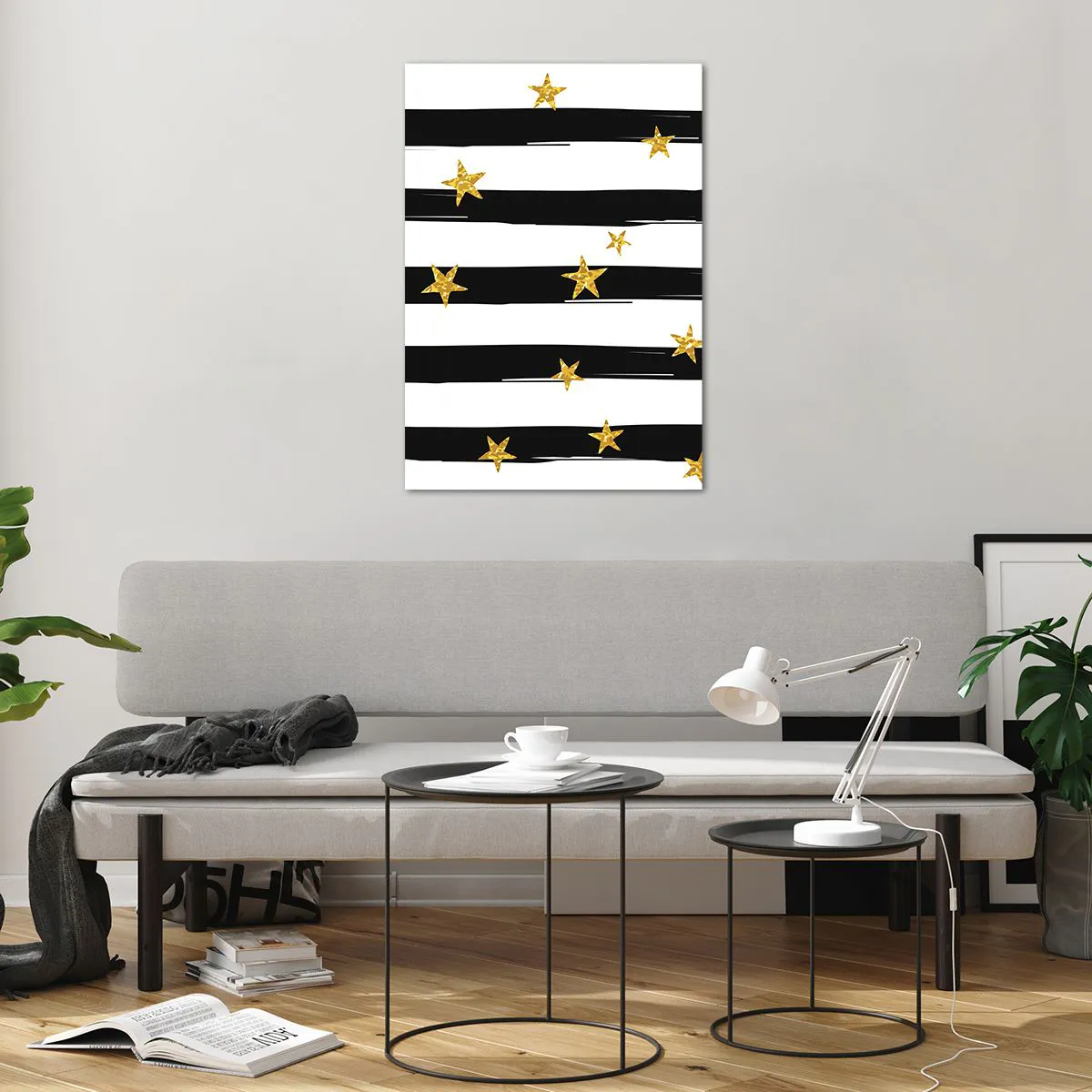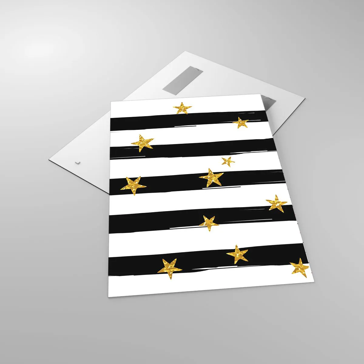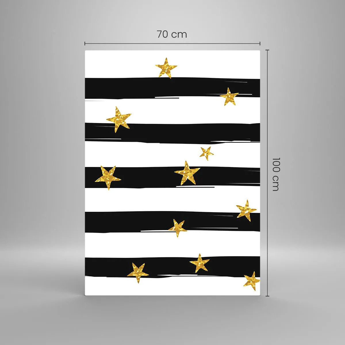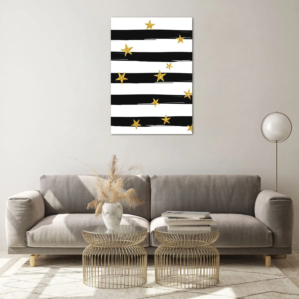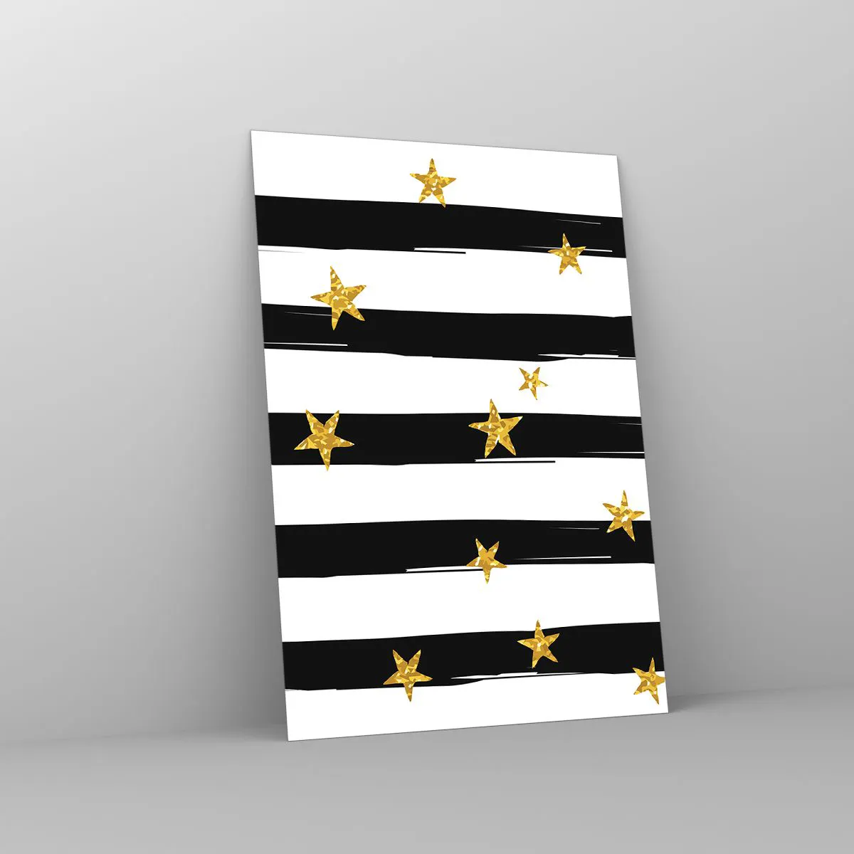 Impression sur verre - Image sur verre - Rayures noires et blanches avec étoiles dorées - 70x100cm - Nous sommes tous nés sous une bonne étoile - Décoration murale moderne pour le salon et la chambre ARTTOR