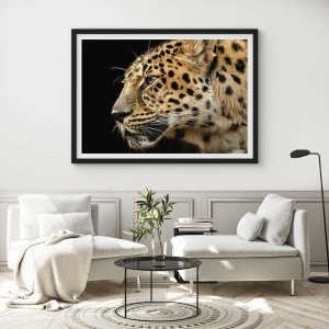 Affiche dans un cadre noir - Poster - Gros plan d'une tête de léopard sur fond noir - 100x70cm - Calme, concentré, prêt - Décoration murale moderne pour le salon et la chambre ARTTOR