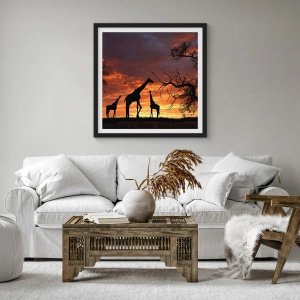 L'affiche « Un petit dîner avec vos proches » représente un paysage de safari africain unique, avec des silhouettes de girafes visibles sur le coucher du soleil. Les couleurs intenses du coucher de soleil, notamment les oranges et les rouges, créent une atmosphère unique, soulignant la nature sauvage et la beauté de la nature. Les contours subtils des animaux harmonisent la composition, faisant de cette affiche une décoration unique.