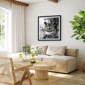 Affiche dans un cadre noir - Poster - Une photo en noir et blanc d'un hibou aux yeux jaunes - 70x50cm - Rien ne se cachera - Décoration murale moderne pour le salon et la chambre ARTTOR