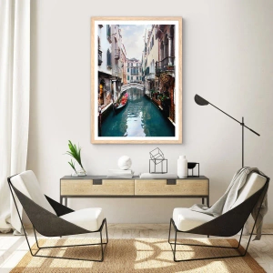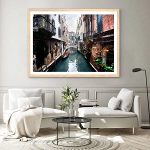 Affiche dans un chêne clair - Poster - Paysage vénitien avec une gondole et un pont - 60x60 cm