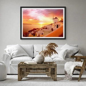 Affiche dans un cadre noir - Poster - Santorin au coucher du soleil avec un moulin à vent - 70x50cm - Fondre en blanc et or - Décoration murale moderne pour le salon et la chambre ARTTOR