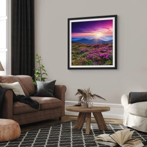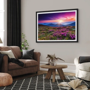 Affiche dans un cadre noir - Poster - Prairie de montagne avec des fleurs au coucher du soleil - 70x50cm - Les herbes sentaient les grappes fraîches de la récolte - Décoration murale moderne pour le salon et la chambre ARTTOR