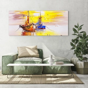 La peinture sur verre est faite sur un verre de 4 mm d'épaisseur. Les bords du verre ont une arête trapézoïdale mate. La tableau est sûr à l'utilisation et prêt à être accroché - il a des crochets en métal attachés à l'arrière du cadre et des entretoises en mousse permettant la régulation uniforme de la distance du tableau au mur.