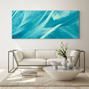 Impression sur verre - Image sur verre - Gros plan de délicates plumes turquoises - 140x50cm - Se noyer dans les plumes - Décoration murale moderne pour le salon et la chambre ARTTOR