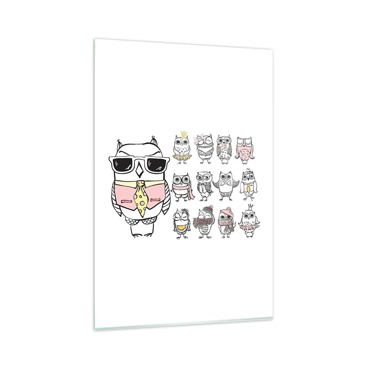 Impression sur verre - Image sur verre - Des hiboux dans différents styles et vêtements - 80x120cm - Tant de rôles à jouer - Décoration murale moderne pour le salon et la chambre ARTTOR
