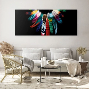 Impression sur verre - Image sur verre - Plumes colorées disposées en ailes sur fond noir - 50x70cm - Collier indien - Décoration murale moderne pour le salon et la chambre ARTTOR