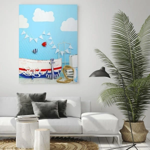 Impression sur verre - Image sur verre - Décoration nautique avec un bateau et des accessoires sur fond bleu - 80x120cm - Nostalgie infantile de l'aventure - Décoration murale moderne pour le salon et la chambre ARTTOR