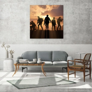Impression sur verre - Image sur verre - Soldats sur fond de soleil couchant dans un décor dynamique - 120x50cm - Brothers in arms - Décoration murale moderne pour le salon et la chambre ARTTOR